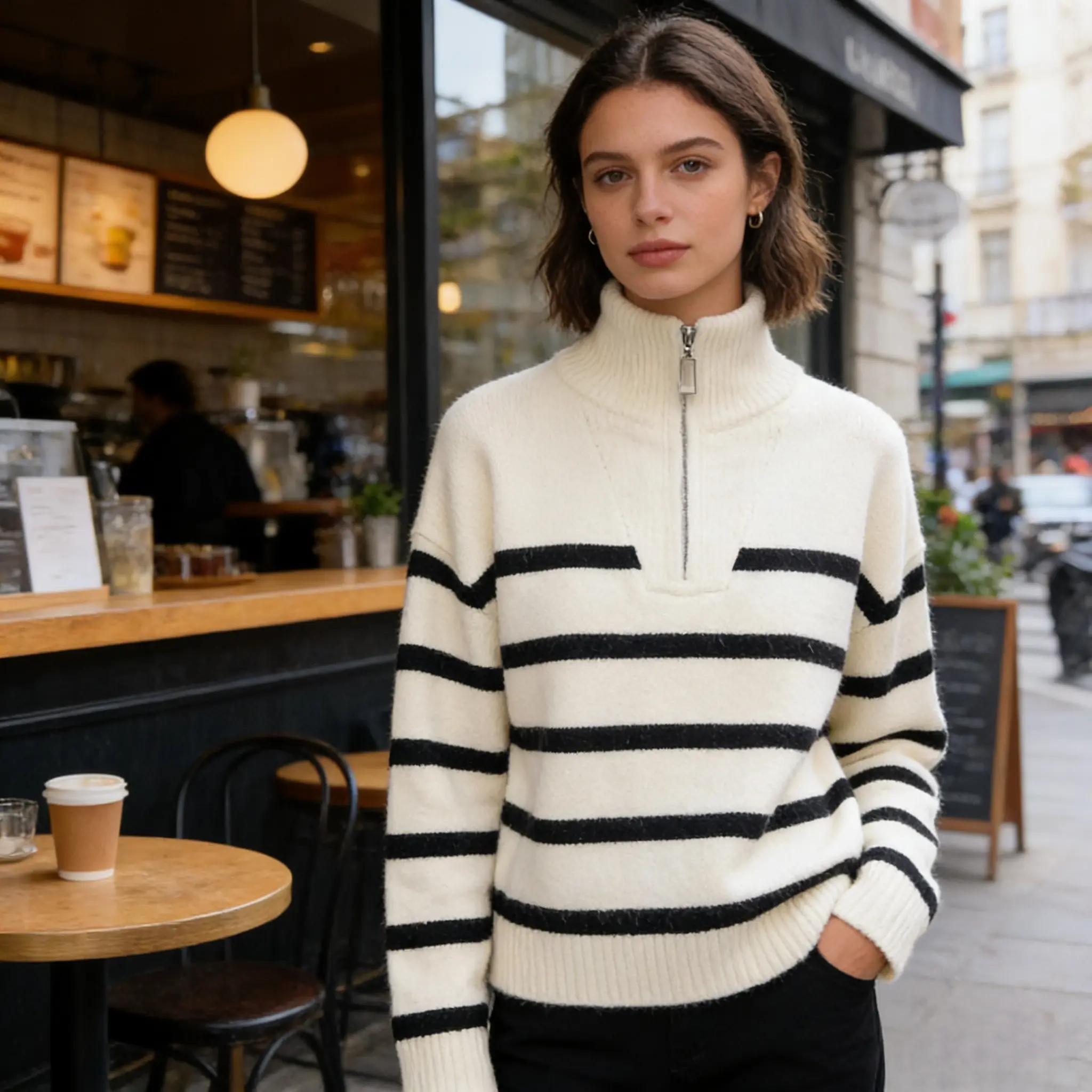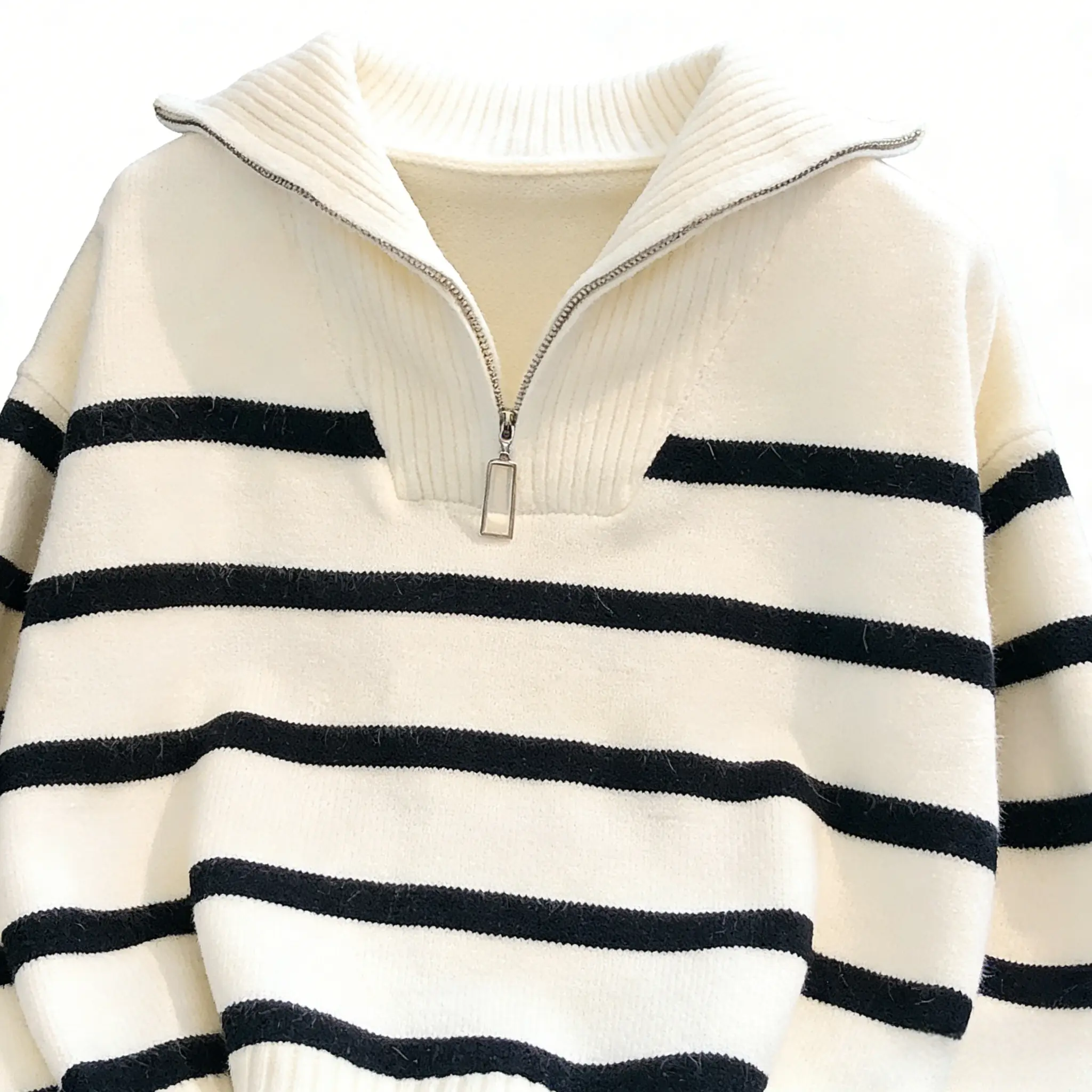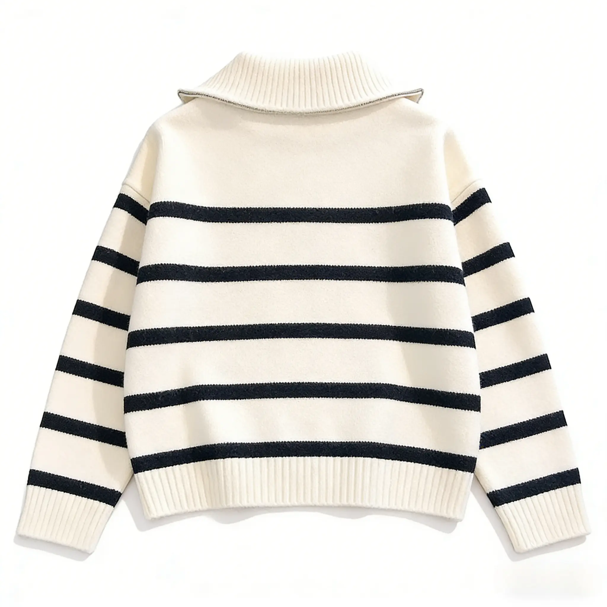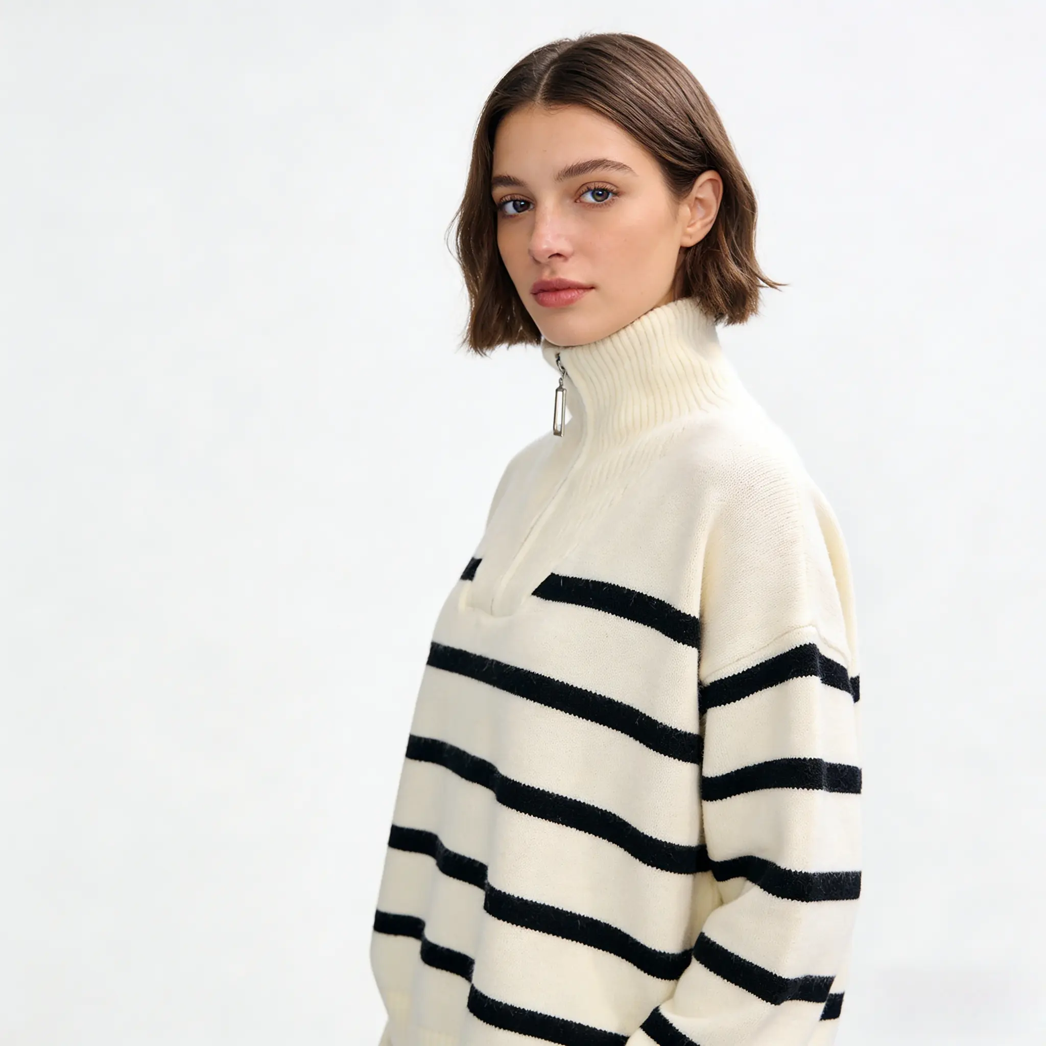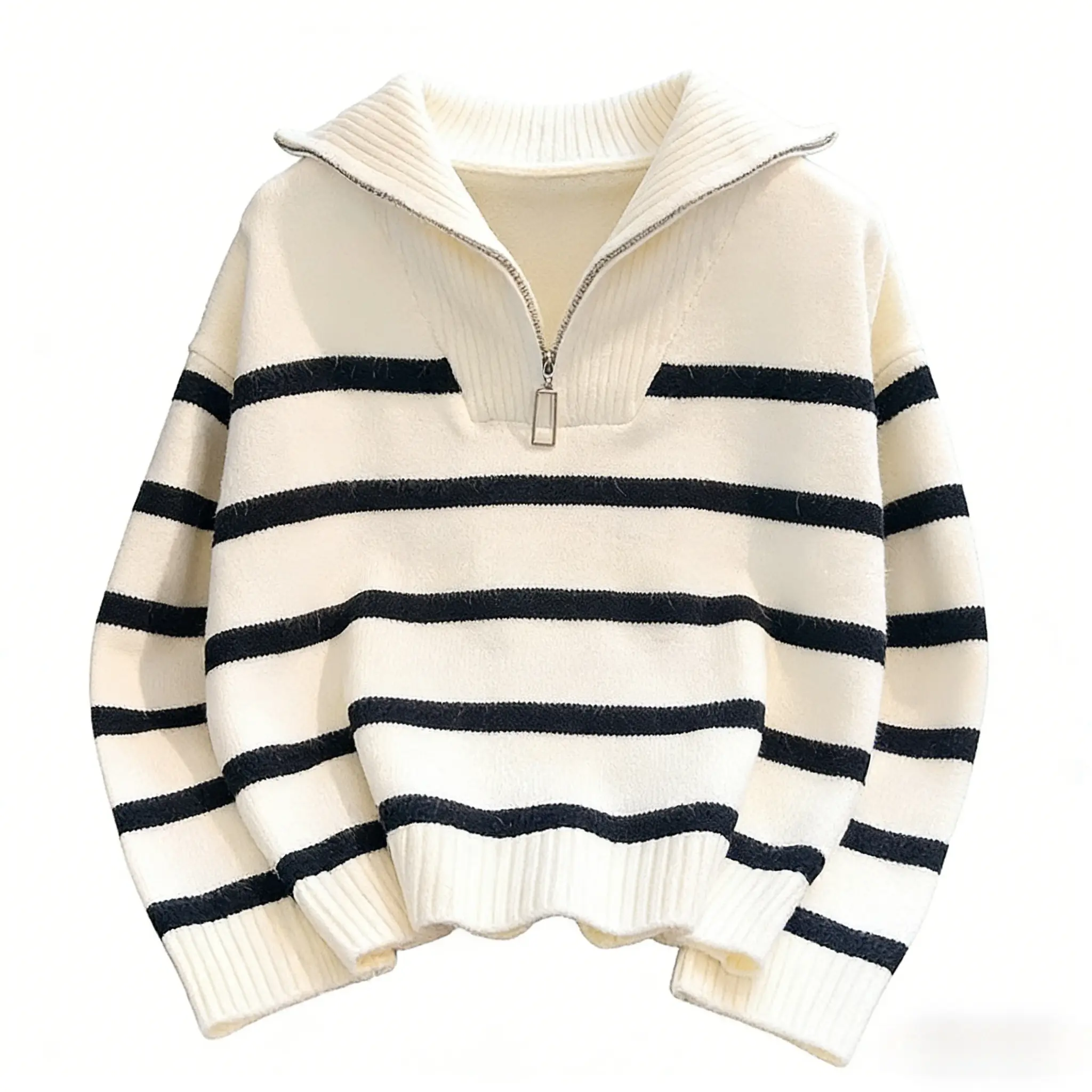 Product Overview Achieve an effortlessly chic Parisian aesthetic with our Women’s Striped Half-Zip Knit Sweater. This contemporary take on the classic Breton stripe features a versatile quarter-zip neckline, allowing you to switch between a sophisticated polo collar and a cozy high-neck funnel. Designed with a relaxed, slightly oversized fit, this pullover balances coastal heritage with modern urban comfort, making it a must-have for autumn and winter layering.