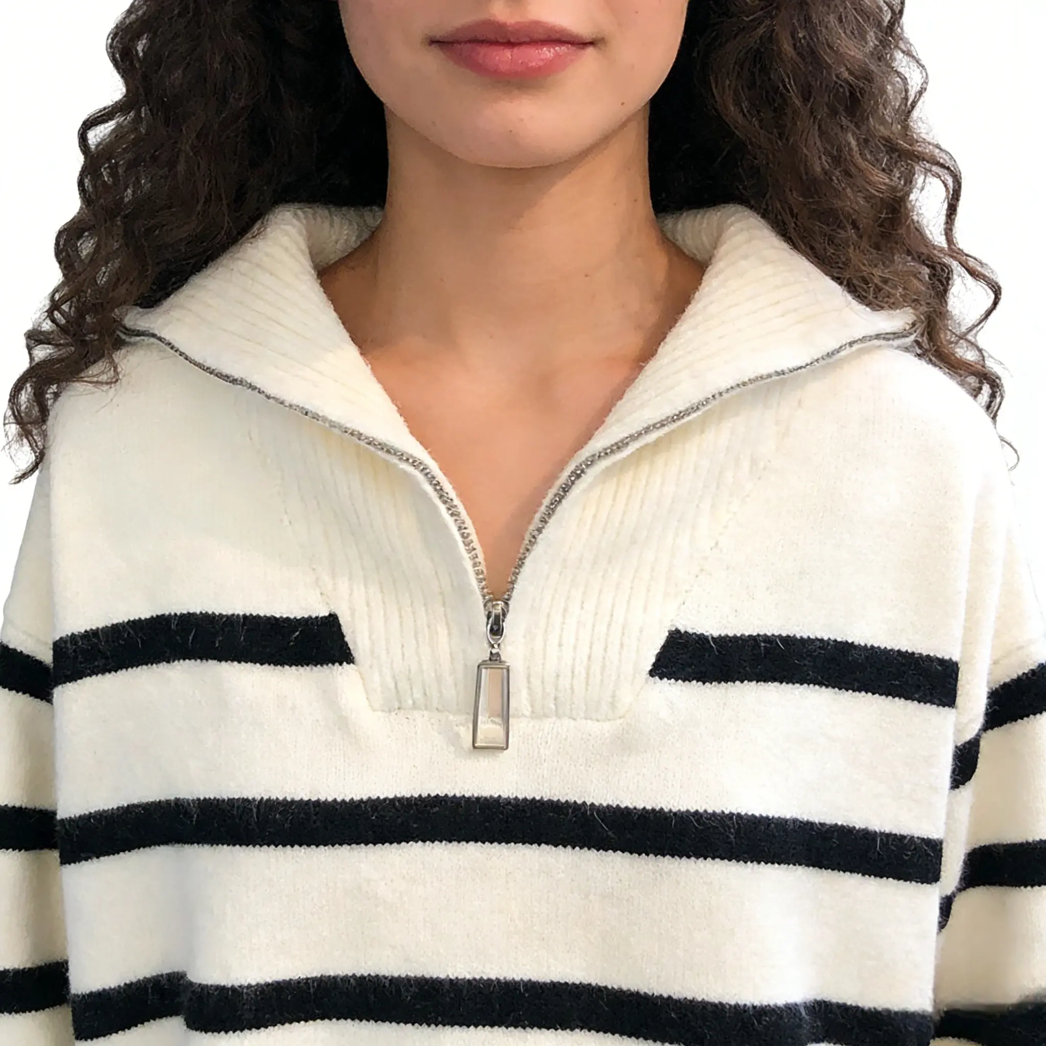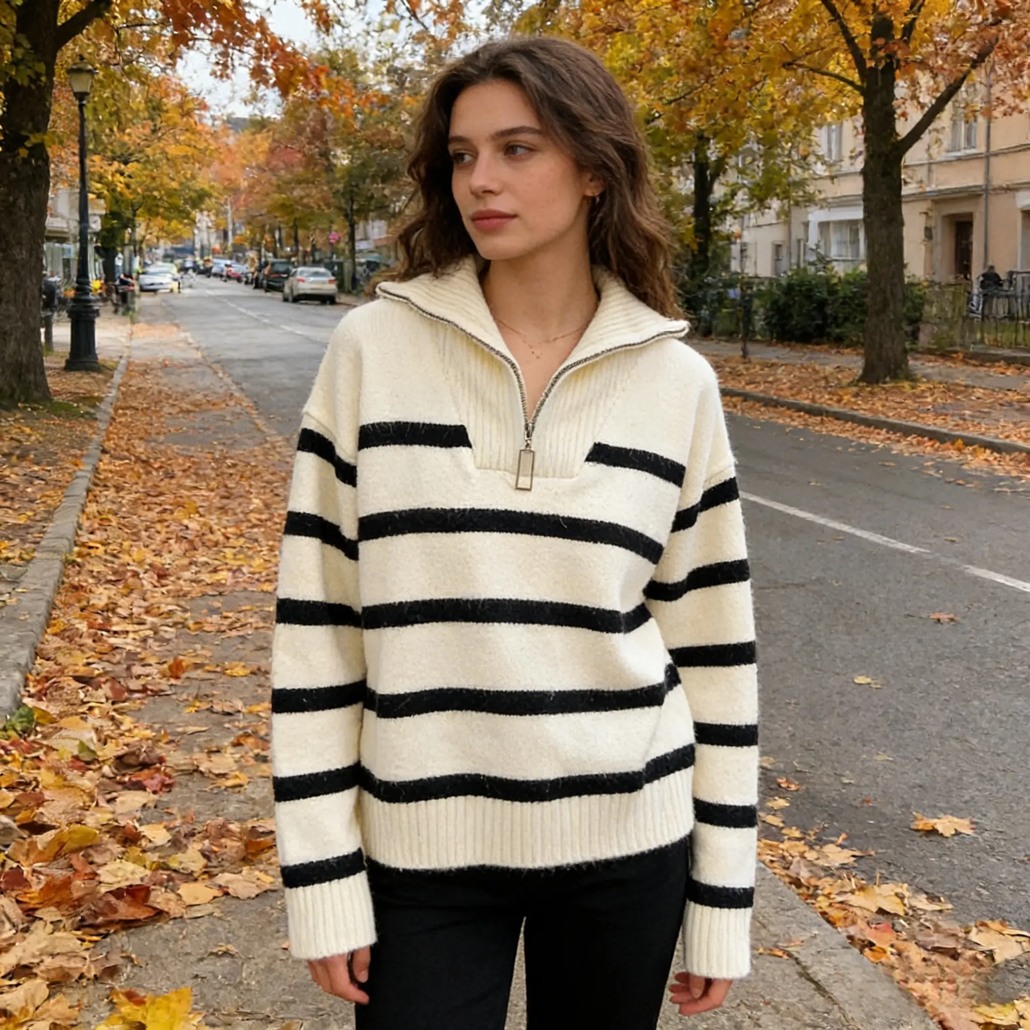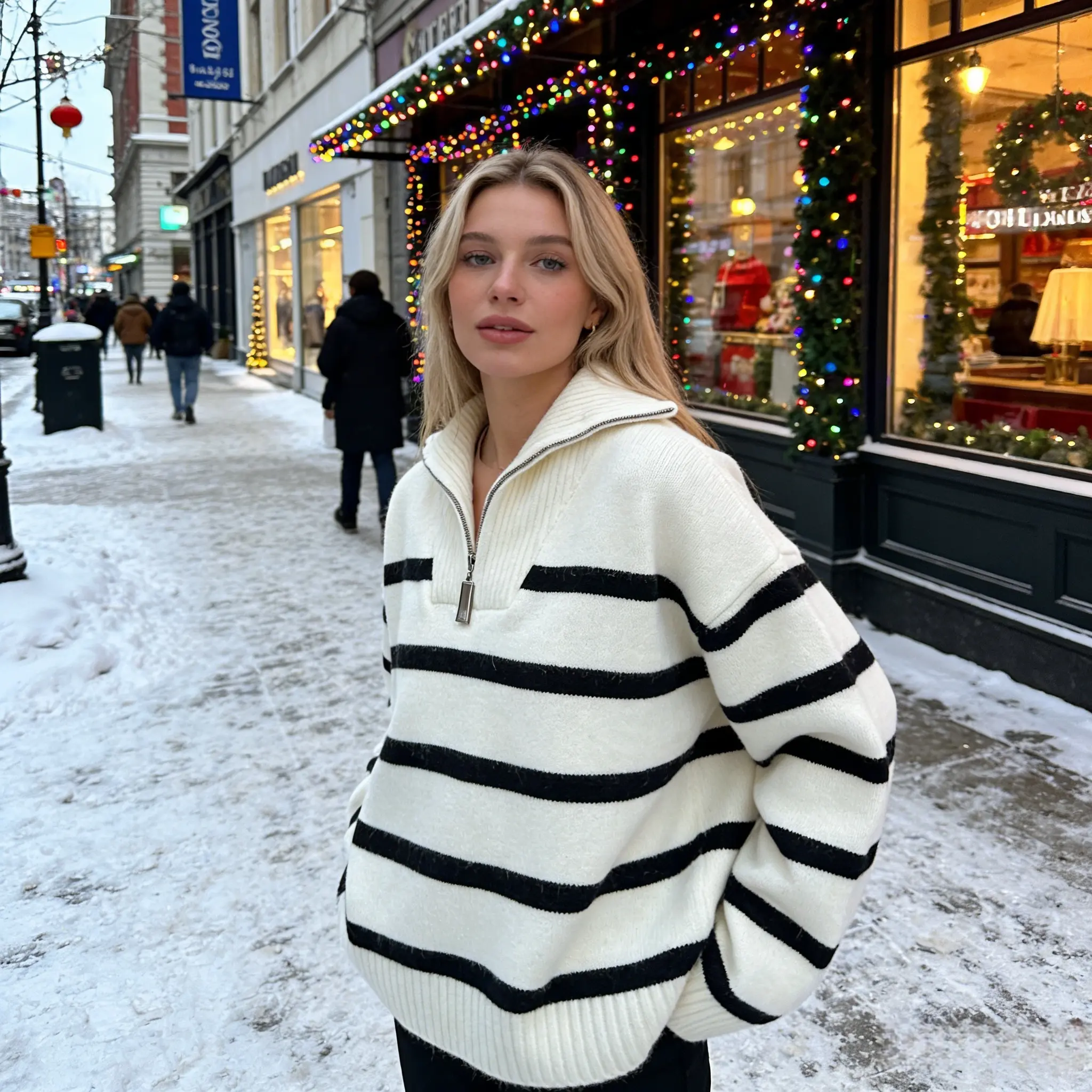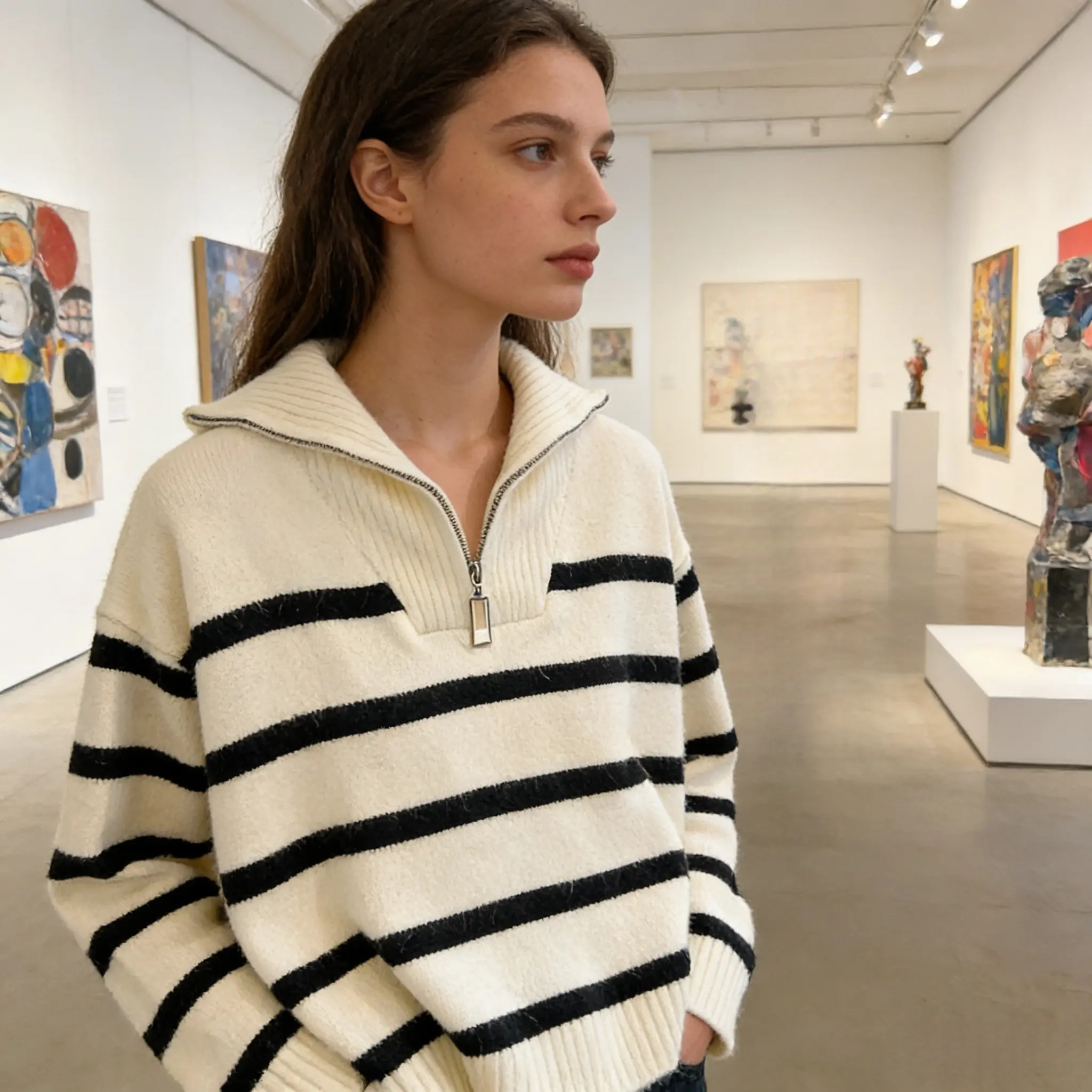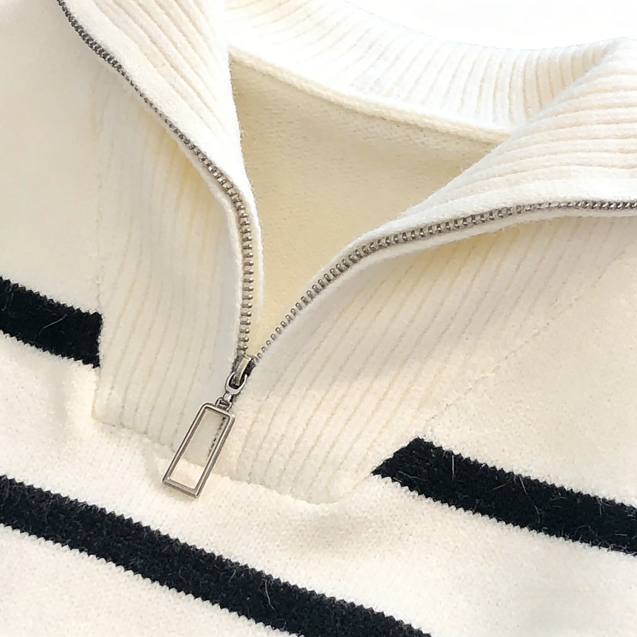 Product Overview Achieve an effortlessly chic Parisian aesthetic with our Women’s Striped Half-Zip Knit Sweater. This contemporary take on the classic Breton stripe features a versatile quarter-zip neckline, allowing you to switch between a sophisticated polo collar and a cozy high-neck funnel. Designed with a relaxed, slightly oversized fit, this pullover balances coastal heritage with modern urban comfort, making it a must-have for autumn and winter layering.
